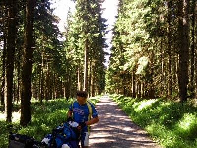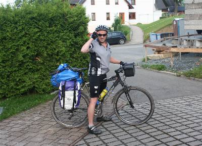 Falk startete schon 5:45 in DC (an der Garage) in Richtung Annaberg (das liegt quasi auf der Strecke) um dort noch einen halben Tag seinem Broterwerb nachzugehen. Eine sehr merkwürdige Vorstellung, die gewohnte Arbeitsstrecke zu fahren und dran zu denken, dass noch 2.700 km vor einem liegen. Der Wetterbericht hatte für die nächsten Tage zumindest schon mal hervorragendes (Fahrrad-)Reisewetter ausgegeben. Das hob die Motivation noch einmal. In Annaberg hatte Falk den großen Packsack mit dem sperrigen Kochgeschirr, Zelt und Luftmatratze nochmal anders justiert, denn das Ganze kam schon auf den ersten 24 km ziemlich ins Rutschen. Frank ist 11.45 in Auerbach gestartet und befand, dass sich das schwer bepackte Rad erstmal ziemlich bockig verhielt. Es ist ist tatsächlich so, dass es sofort zu schwanken beginnt wenn man mal aus dem Sattel geht. Aber nach einiger Zeit hat man sich dran gewöhnt und hält das Geeier für ziemlich normal. Wir trafen uns dreiviertel Eins in Wiesa und sind dann erst Zschopau-abwärts, dann Preßnitz-aufwärts bis Mittelschmiedeberg gefahren. |