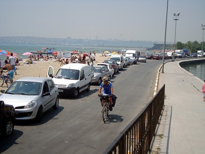 Falk war voraus und hat den Abzweig auf den Holperweg am Ostufer gar nicht für voll genommen. Übermotiviert war er schon den halben Berg wieder hoch, ist dann aber doch wieder umgedreht, als keiner nachkam. Die Holperpiste hatte den Vorteil, dass wir uns ohne Autoverkehr schon weit an die City annähern konnten. Wir waren allerdings auch arg überrascht, als ausgerechnet hier auf den letzten paar Kilometern einige Hunde auf uns losgingen. Falk hatte das Pfefferspray schon im Anschlag. Der Hirte hat seine drei durchtrainierten Viecher zum Glück noch rechtzeitig erfolgreich zurückgerufen. Nach einer Trink- und einer Eispause sowie einem kurzen Geburtstagsanruf in der Heimat wurde dann auch das Verkehrschaos an einer Autobahnauffahrt unbeschadet überstanden. Die Leute fahren hier schon sehr zügig, aber nicht wirklich aggressiv. Angehupt wird man dauernd, mal als freundlicher Gruß, mal als Warnung, mal als Aufforderung, sich schnell in Luft aufzulösen. Nach drei Tagen Türkei weiß man, das einfach zu ignorieren oder freundlich zu winken. |